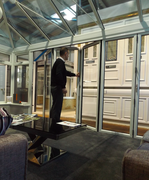 Internal shot of Lee in our Lowestoft Showroom at Mobbs Way, Oulton Broad trying our range of bi fold doors.